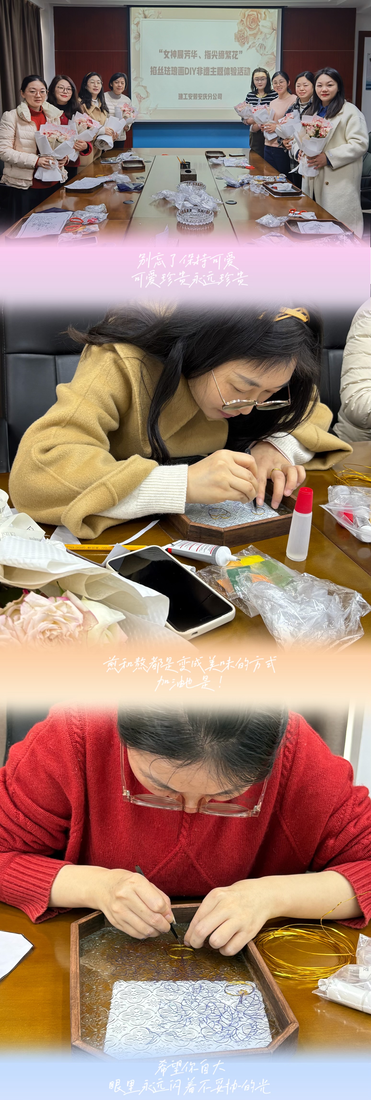 一年一度(du)春(chun)風暖,如詩如畫(hua)三(san)月天。在第115個“三(san)八”國際(ji)勞動(dong)婦女(nv)節來臨之際(ji),為豐富女(nv)職工(gong)(gong)的文(wen)化(hua)生活,激(ji)發(fa)女(nv)職工(gong)(gong)干事創業的工(gong)(gong)作熱(re)情,增強女(nv)性職工(gong)(gong)歸(gui)屬(shu)感、幸福感,建工(gong)(gong)安裝安慶分公司(si)于3月7日開展(zhan)“女(nv)神(shen)展(zhan)芳華、指尖(jian)締繁花”掐絲琺瑯畫(hua)DIY非(fei)遺(yi)主題體驗活動(dong),讓大(da)家感受傳統(tong)文(wen)化(hua)魅力和工(gong)(gong)匠精神(shen)。