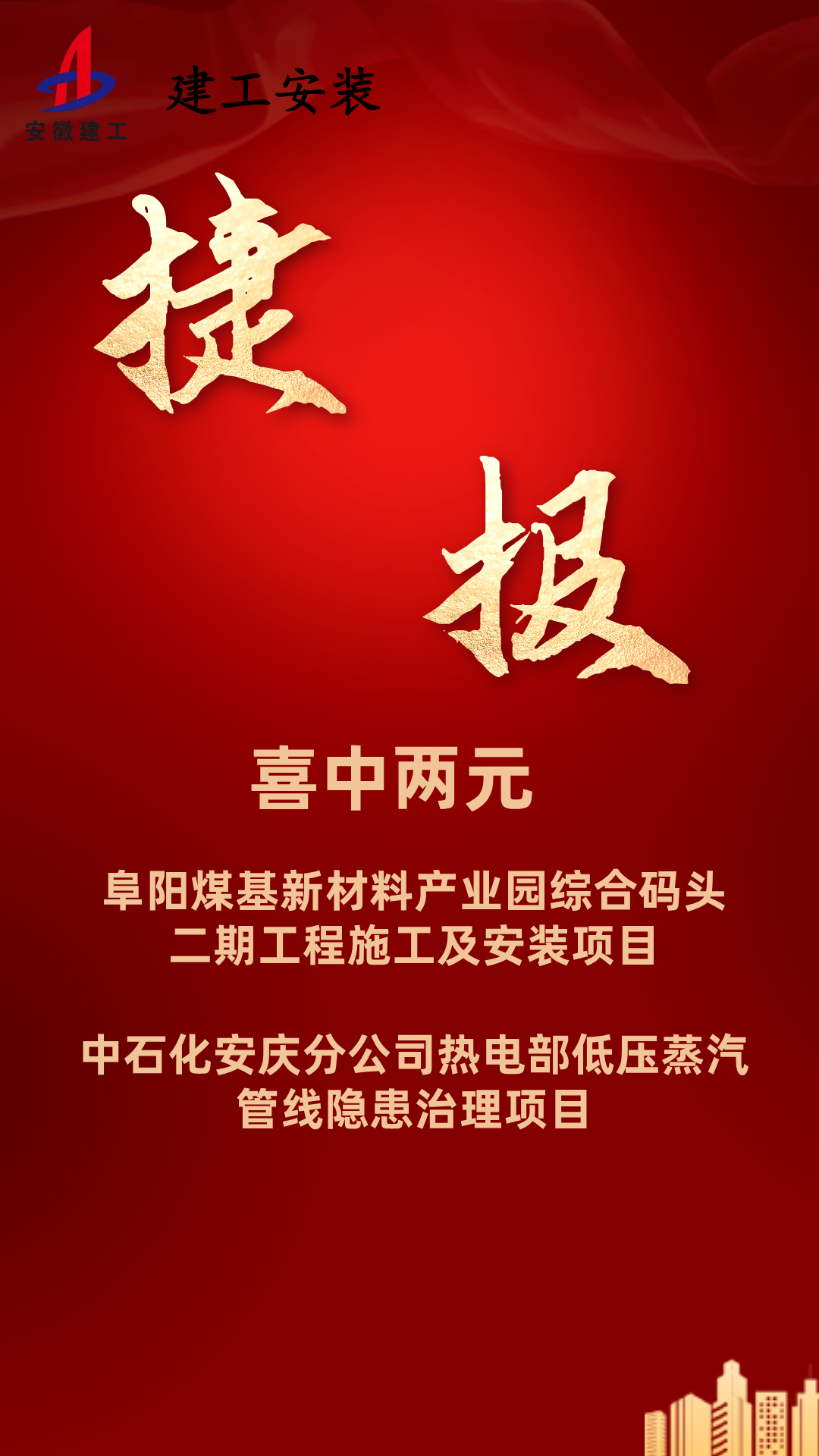 近期(qi),建(jian)工安裝(zhuang)喜中(zhong)兩元(yuan),成功中(zhong)標阜陽煤基新材料產業園綜合碼頭二期(qi)工程施工及安裝(zhuang)項目(mu)以及中(zhong)石化安慶分公司(si)熱(re)電部低壓(ya)蒸汽(qi)管線隱(yin)患治理項目(mu),中(zhong)標總金(jin)額5400萬元(yuan)。