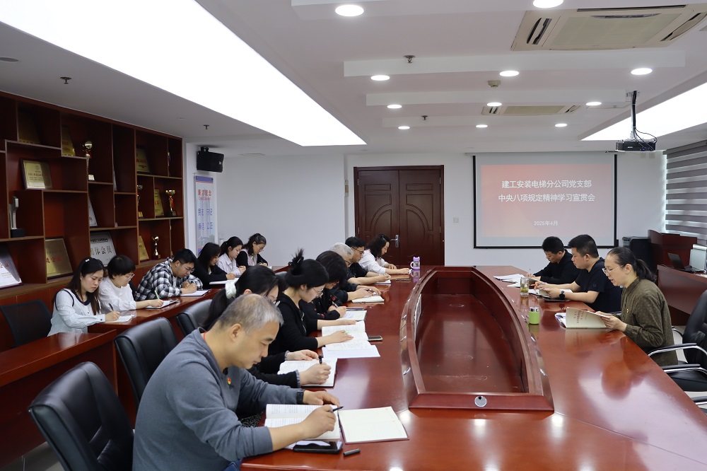 為深入貫徹落(luo)實(shi)中央(yang)八項規定精(jing)神(shen),進一步增強廉潔(jie)自律意識,加(jia)強作風建設,近日,建工安裝電(dian)梯分(fen)公司黨支(zhi)部(bu)組織集中學習中央(yang)八項規定及其實(shi)施細則精(jing)神(shen),分(fen)公司領導(dao)班(ban)子成(cheng)員、支(zhi)部(bu)黨員、部(bu)門負責人參加(jia)。