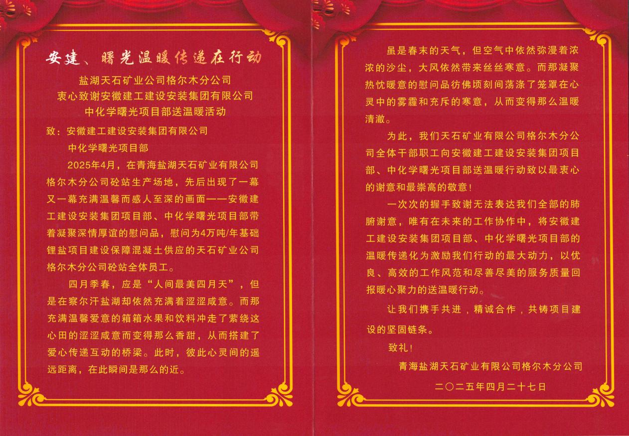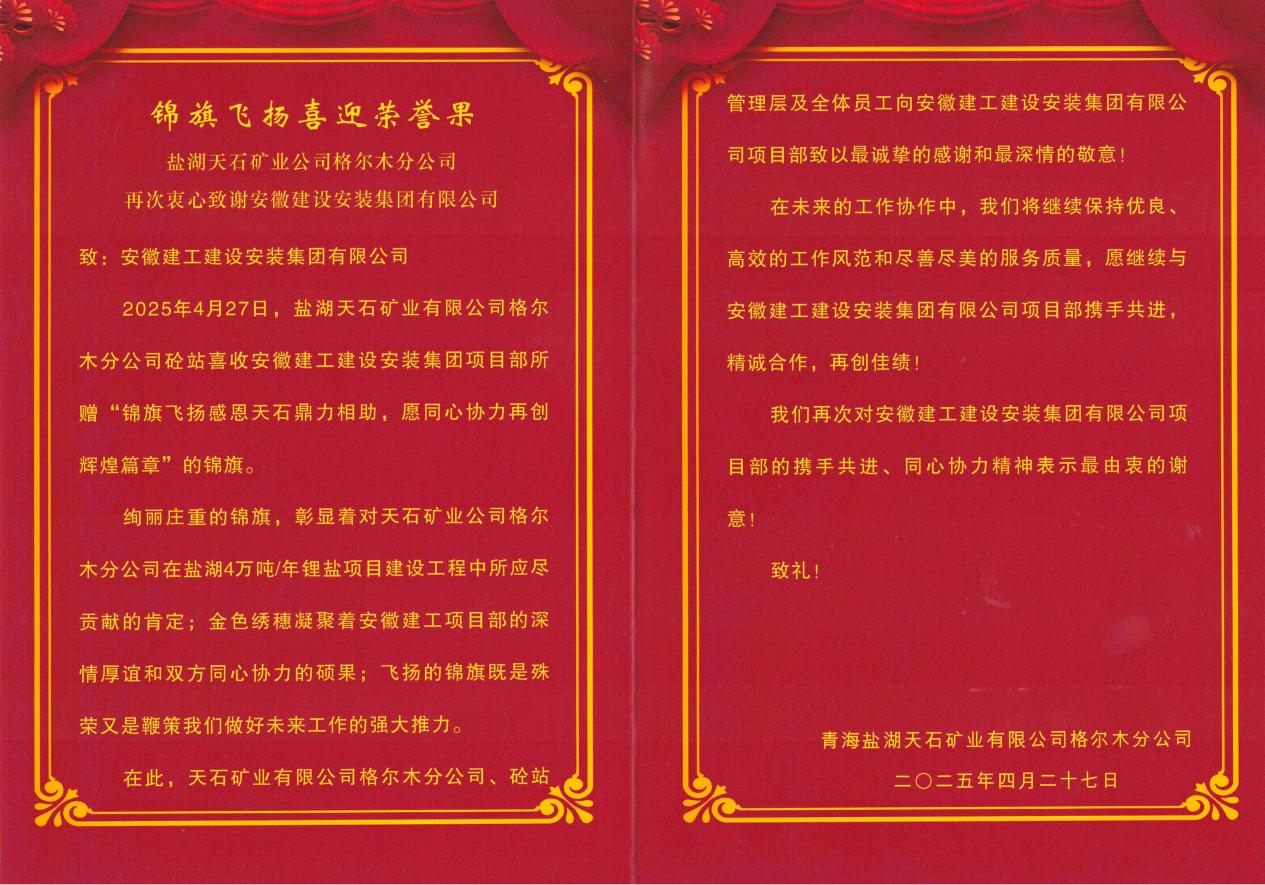 信中(zhong),青(qing)海鹽(yan)湖(hu)天石礦(kuang)業有限公(gong)司格(ge)爾木分公(gong)司對建(jian)工(gong)安(an)裝項(xiang)(xiang)目(mu)(mu)(mu)部此前慰問砼站全體(ti)員(yuan)工(gong)致以最(zui)誠摯的感謝,愿繼(ji)續(xu)與建(jian)工(gong)安(an)裝項(xiang)(xiang)目(mu)(mu)(mu)部攜手(shou)共進、精誠合作(zuo)、再創佳績!這封感謝信不(bu)僅是對項(xiang)(xiang)目(mu)(mu)(mu)部過(guo)往成績的肯(ken)定,更是一(yi)份(fen)振奮人心的激勵。建(jian)工(gong)安(an)裝將繼(ji)續(xu)保持高昂斗志和嚴謹(jin)態度,加強(qiang)與相關單(dan)位溝通協(xie)作(zuo),強(qiang)化(hua)項(xiang)(xiang)目(mu)(mu)(mu)管理,確保項(xiang)(xiang)目(mu)(mu)(mu)按期、高質量(liang)交付(fu),為打造(zao)世界級鹽(yan)湖(hu)提鋰(li)產(chan)業基地貢獻(xian)力(li)量(liang)!