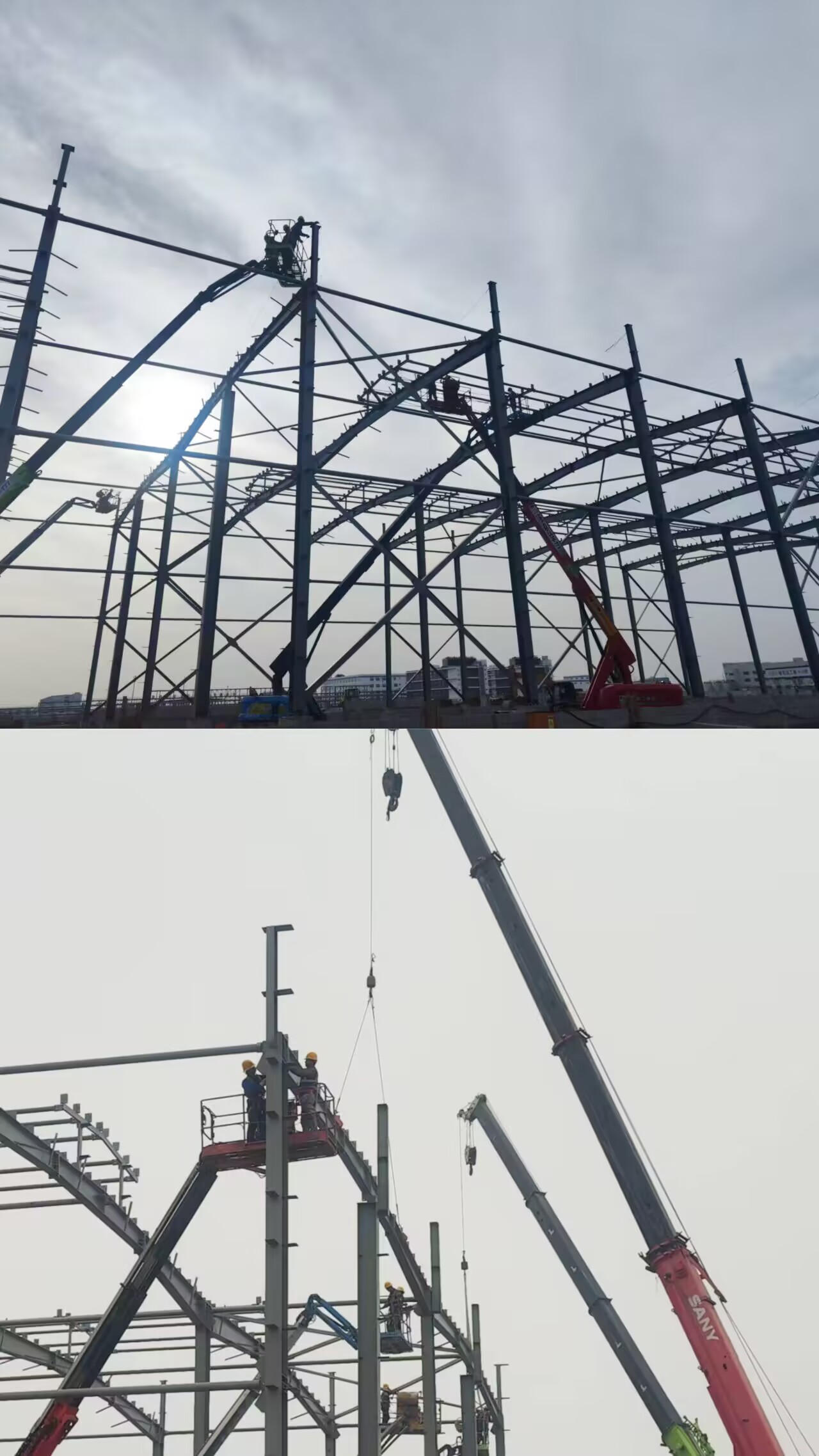 走進項目(mu)施(shi)工現場,起重機揮動著(zhu)(zhu)粗壯的鋼鐵(tie)臂膀(bang)劃(hua)破(po)天(tian)際,將(jiang)一(yi)段段鋼梁精準的吊裝(zhuang)至安(an)裝(zhuang)位(wei),曲臂車托舉著(zhu)(zhu)工人(ren)將(jiang)鋼構件嵌入(ru)到預(yu)定位(wei)置(zhi),保障高空作業人(ren)員(yuan)的生(sheng)命安(an)全(quan)。這是(shi)(shi)力量與(yu)技術的二(er)重奏,更(geng)是(shi)(shi)安(an)全(quan)與(yu)效(xiao)率的完(wan)美(mei)平衡,一(yi)幅現代工業建筑的壯美(mei)畫卷正徐徐展開。