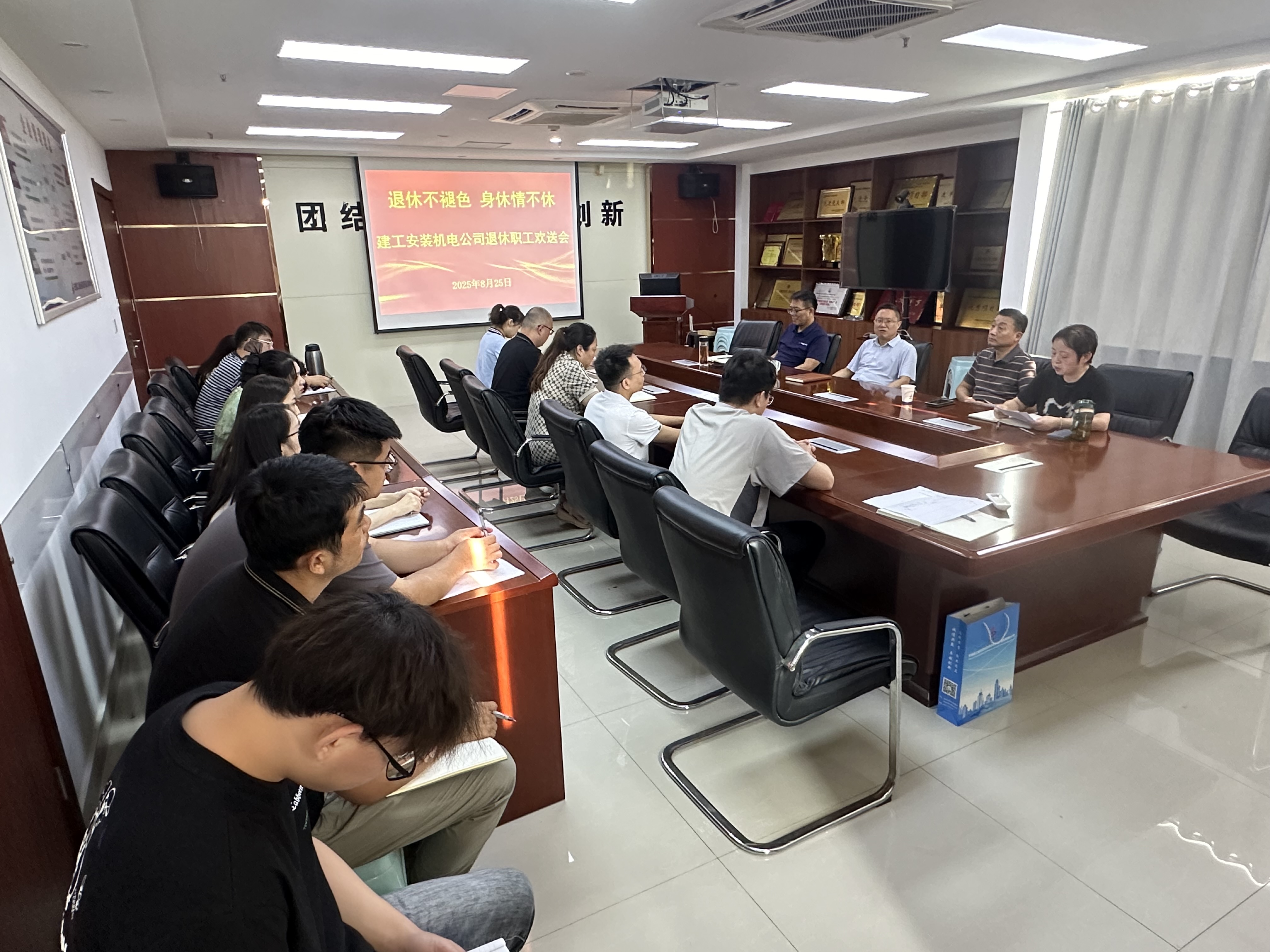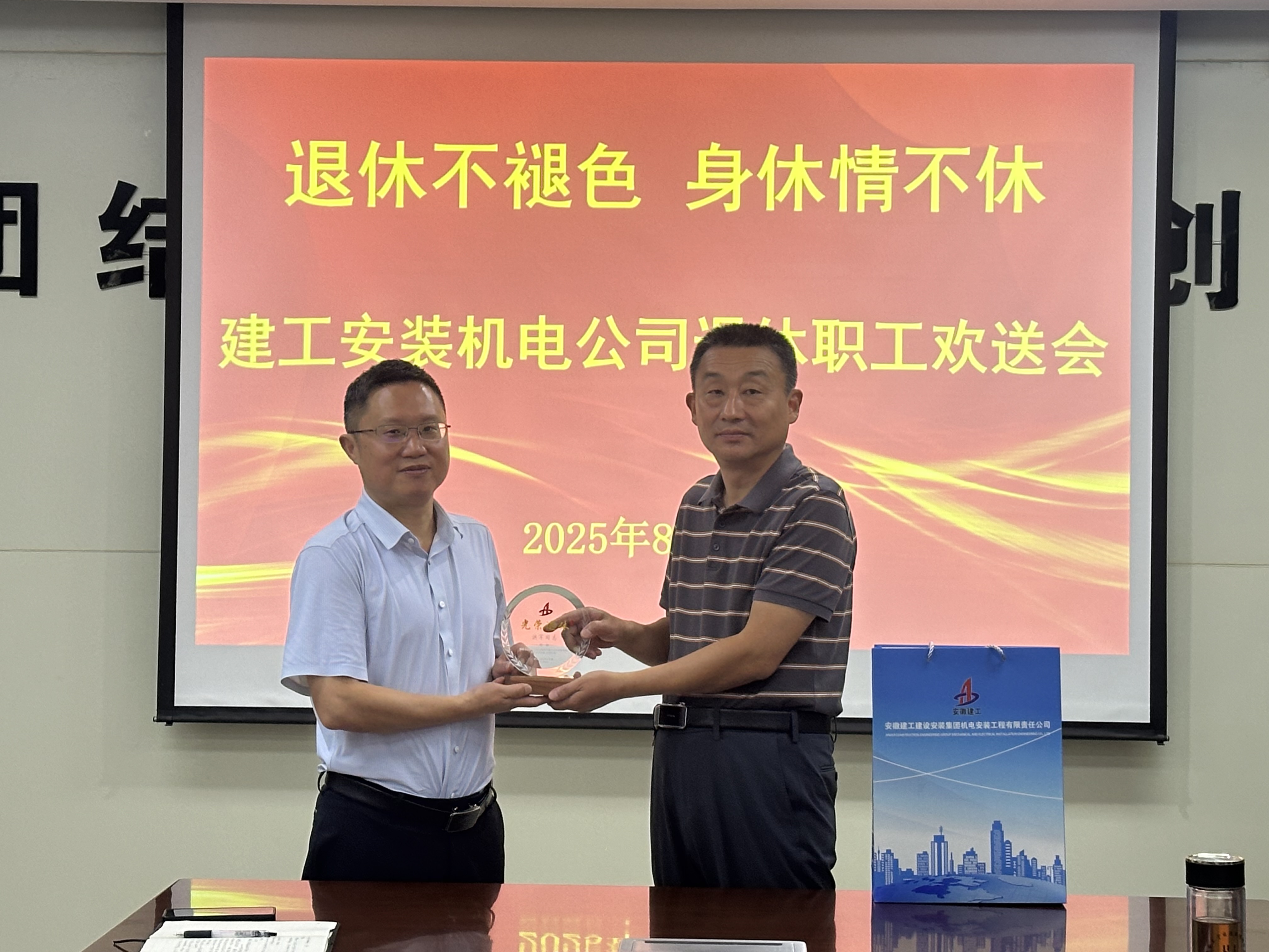 為感謝老職(zhi)(zhi)工多年來對企業(ye)的奉(feng)獻(xian),表達對退(tui)(tui)(tui)休職(zhi)(zhi)工的誠摯祝福,8月25日下午,建工安裝機(ji)電公司舉辦(ban)“退(tui)(tui)(tui)休不褪色,身休情不休”主(zhu)題退(tui)(tui)(tui)休職(zhi)(zhi)工退(tui)(tui)(tui)休儀(yi)式。機(ji)關全(quan)體人(ren)員參會,會議由(you)黨(dang)支部副書(shu)記許素寒主(zhu)持。